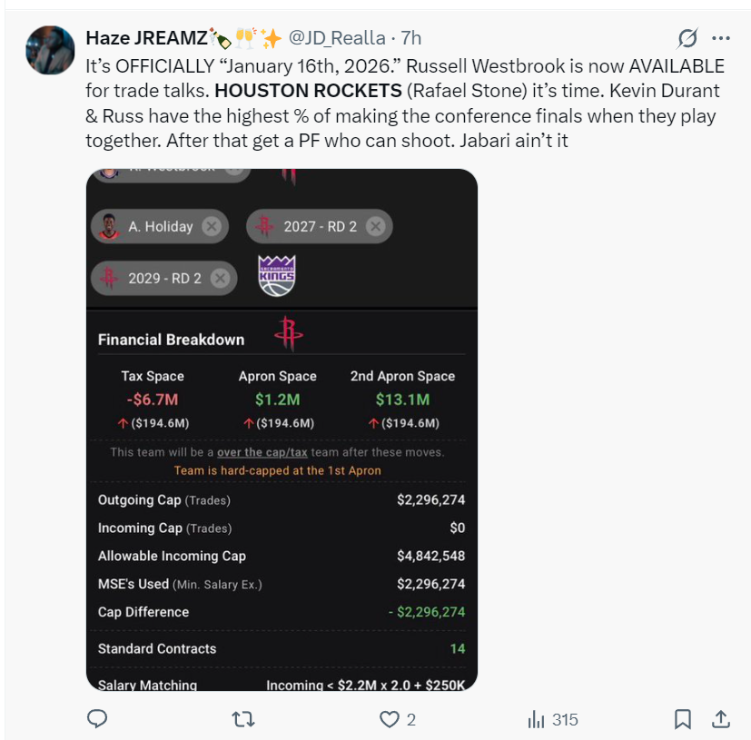 还有火箭球迷甚至建议用霍勒迪、2个次轮签送到国王换拉塞尔-威斯布鲁克,让威少与 杜兰特在休斯顿重聚。